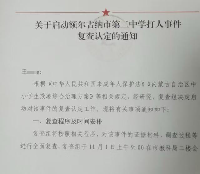 根据额尔古纳市委教育工作领导小组秘书组出具的《关于启动额尔古纳市第二中学打人事件复查认定的通知》显示,经研究,复查组决定启动对该事件的复查认定工作,将按照相关程序,对事件的证据材料、调查过程等全面复查。